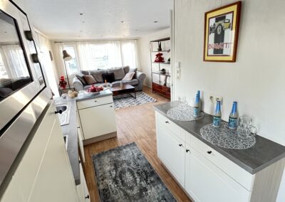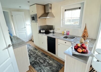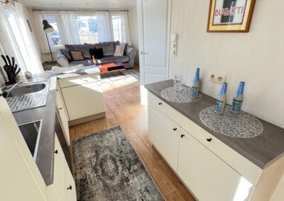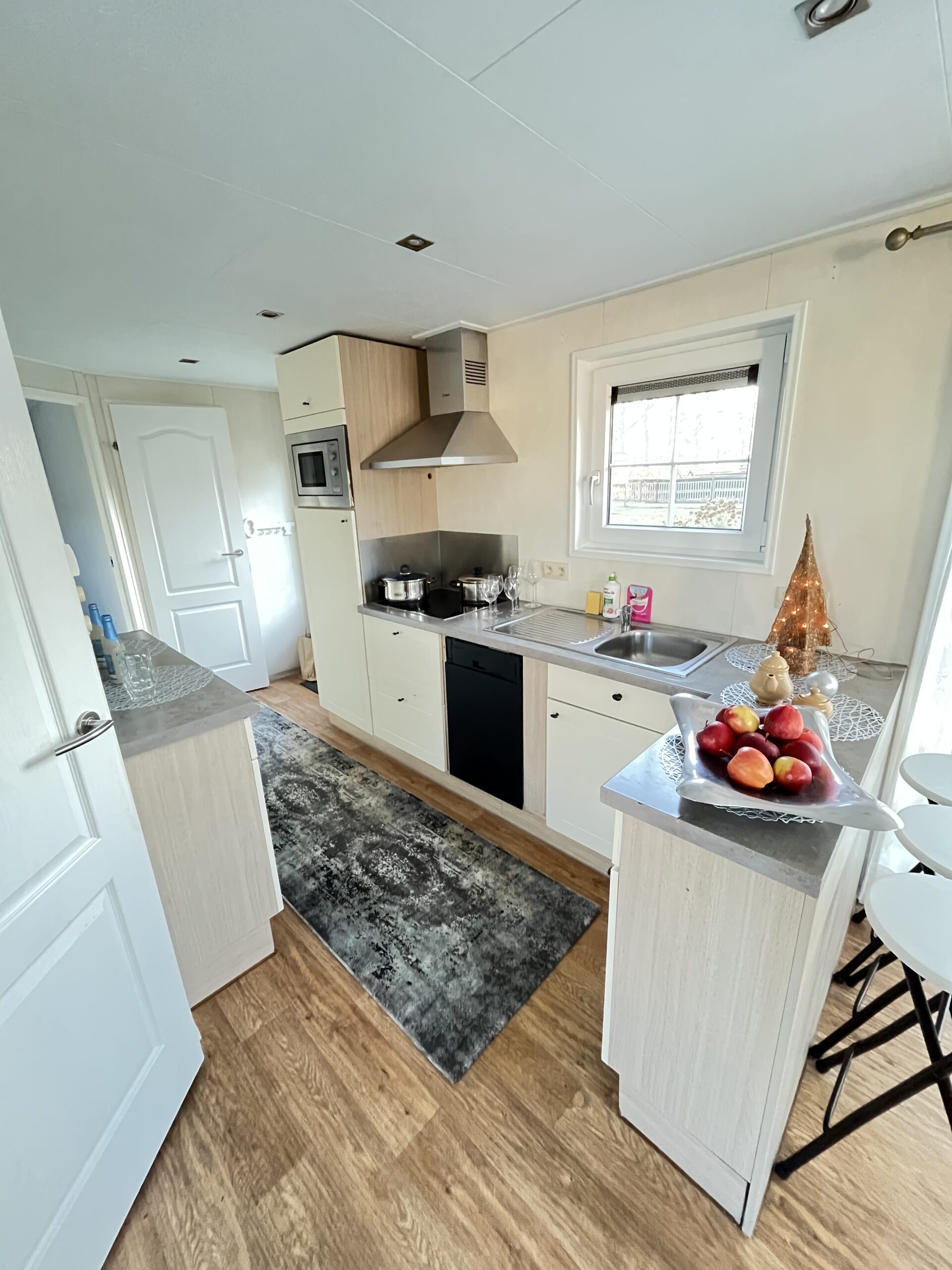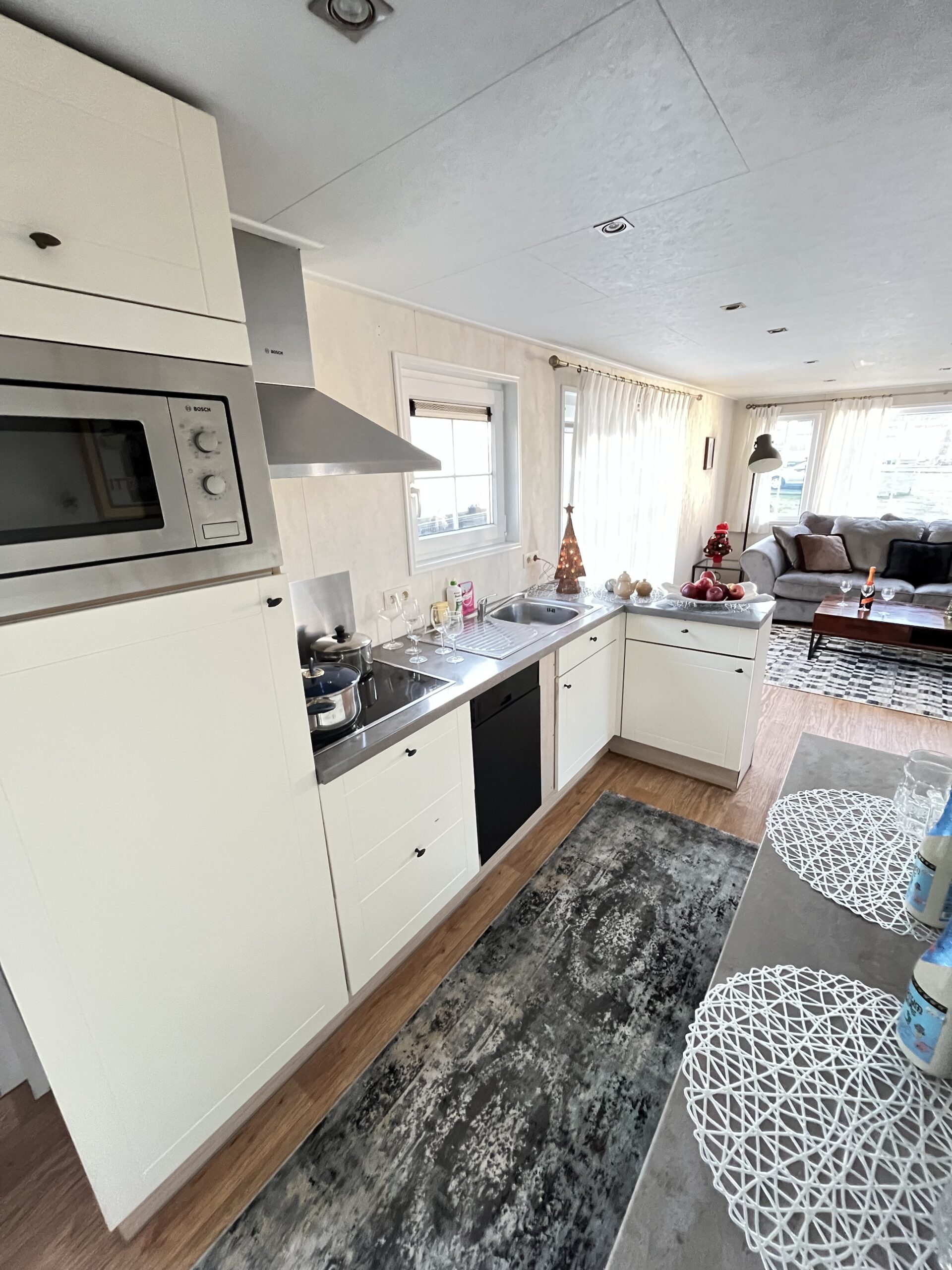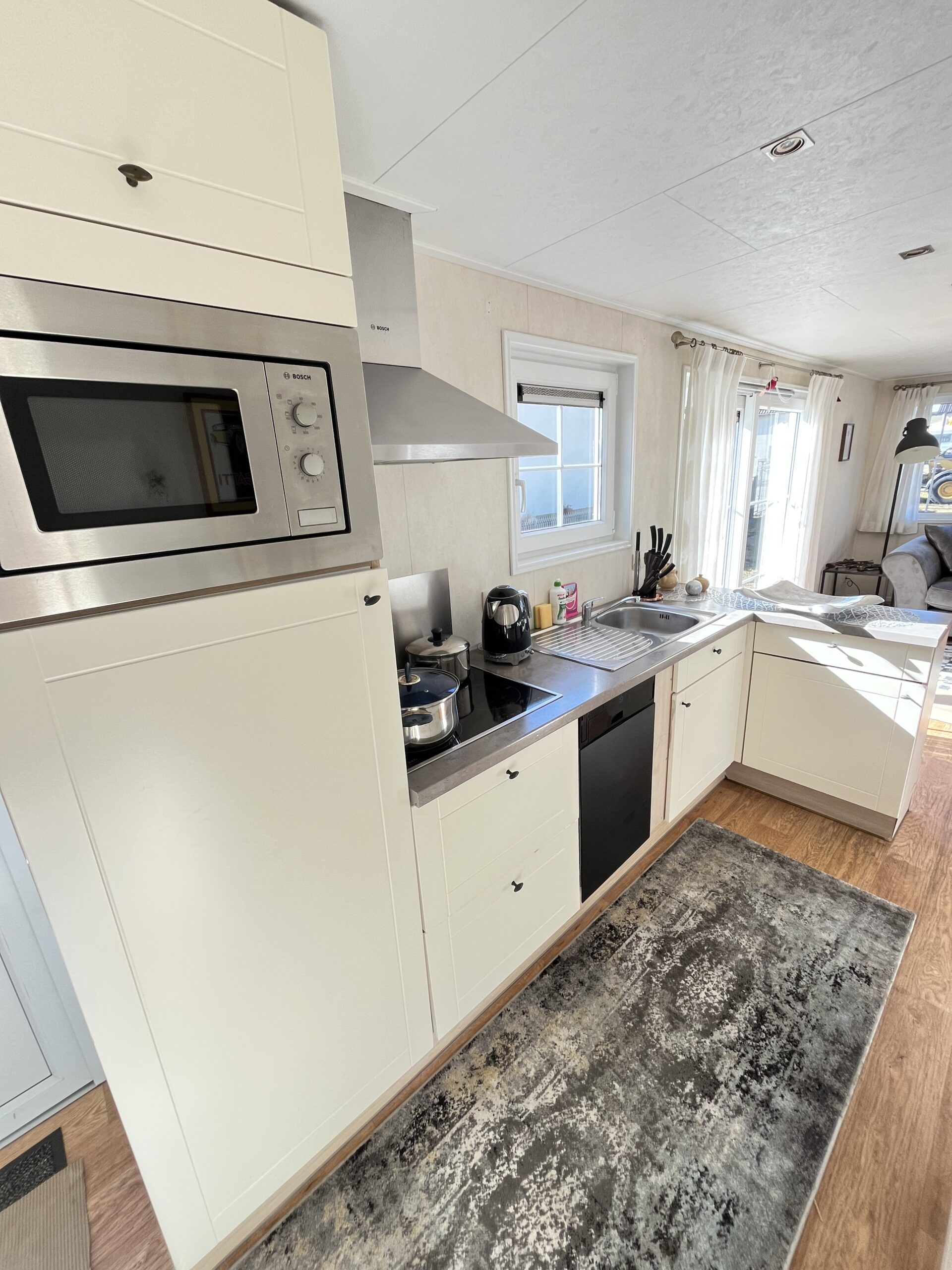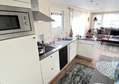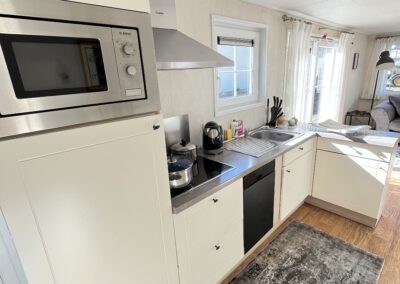 – KUCHNIA: szafki do przechowywania, zlew jednokomorowy z ociekaczem , płyta indukcyjna, okap, lodówka w zabudowie, zmywarka, mikrofalówka, trzy taborety