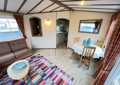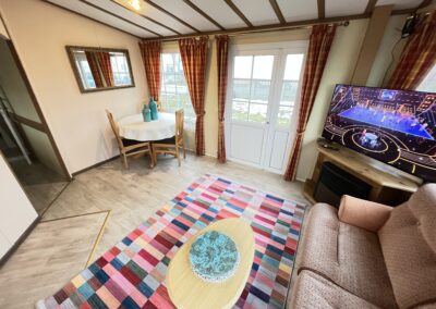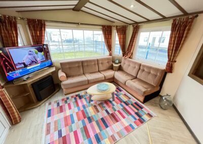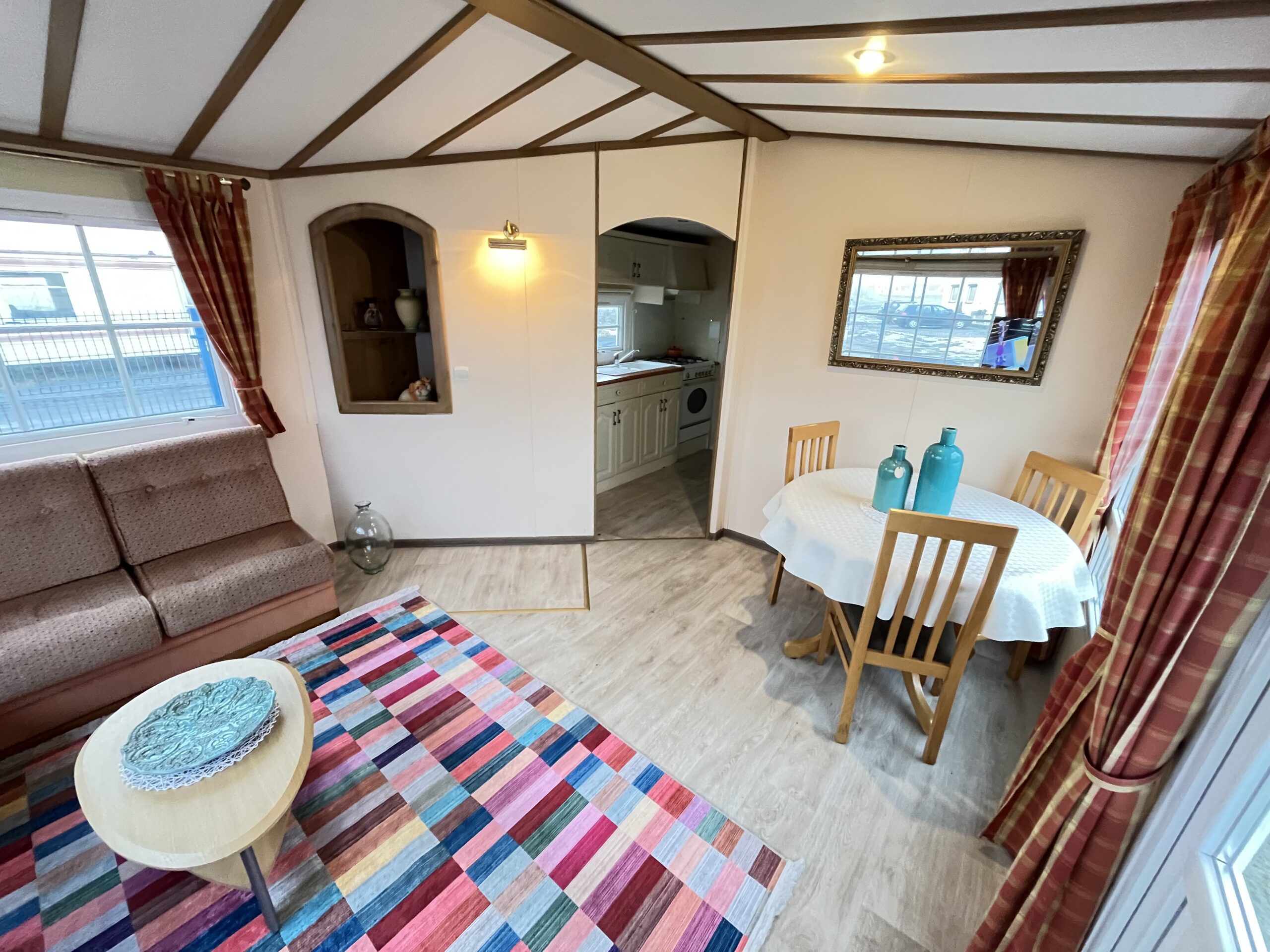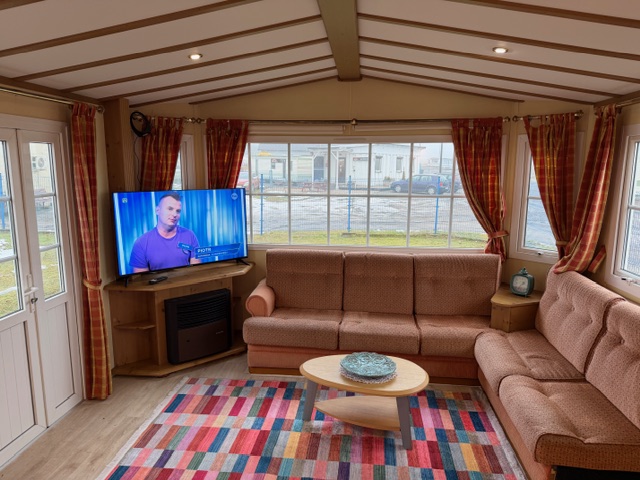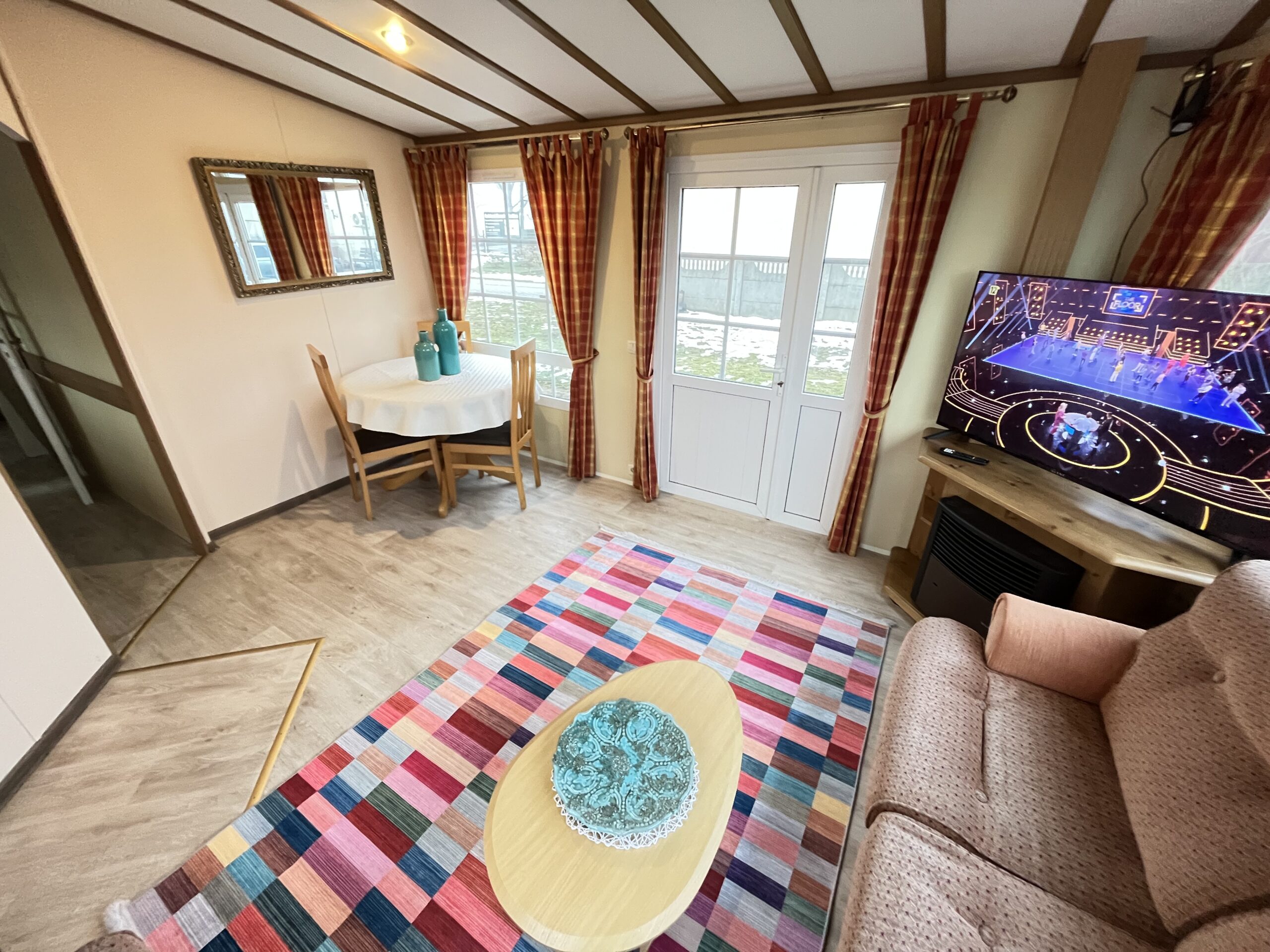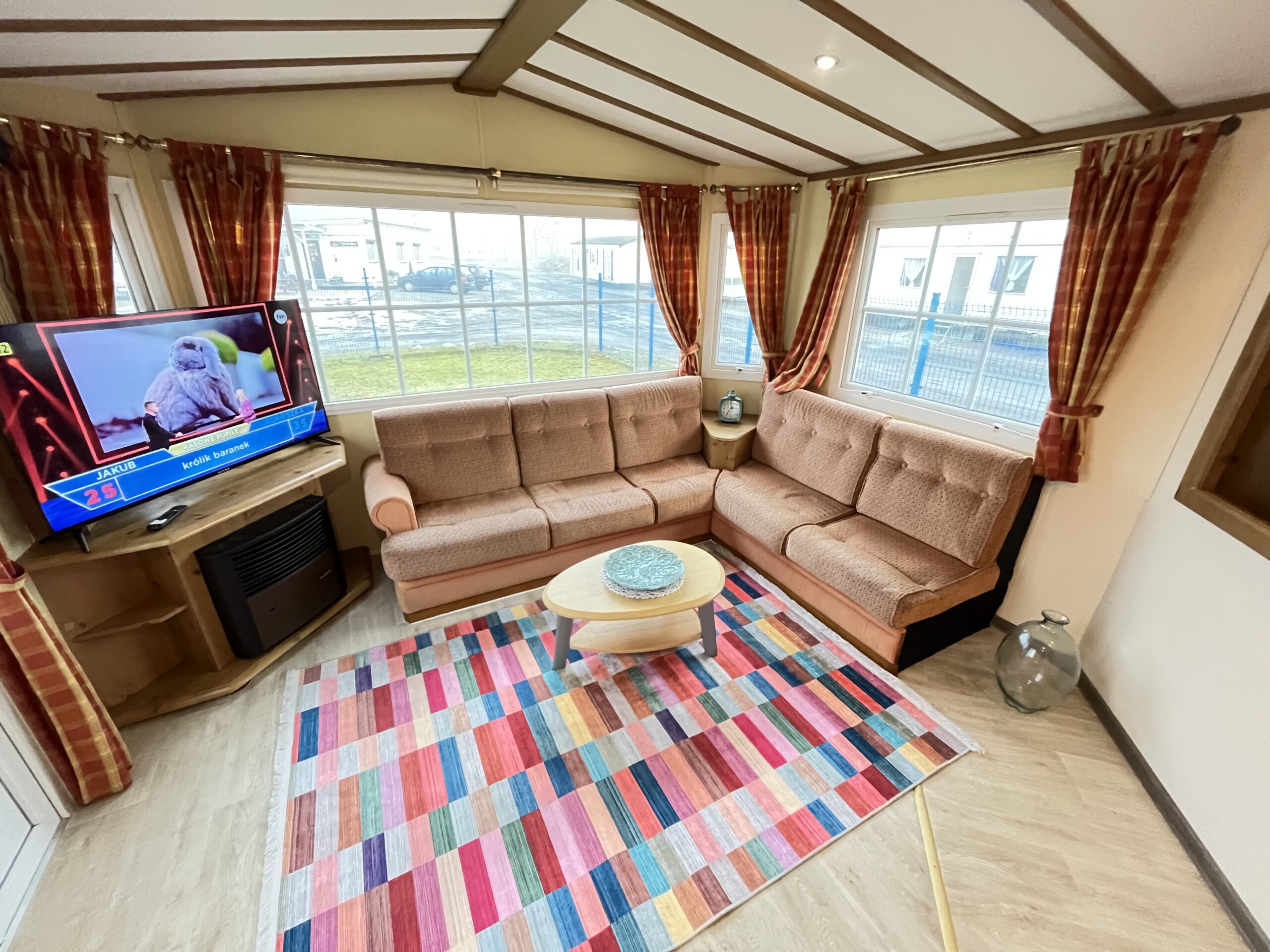 – SALON: Wygodna kanapa z ŁÓŻKIEM POLOWYM w środku, meble do przechowywania, telewizor, stolik, piecyk gazowy do ogrzewania