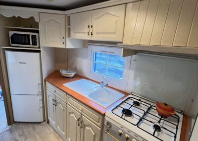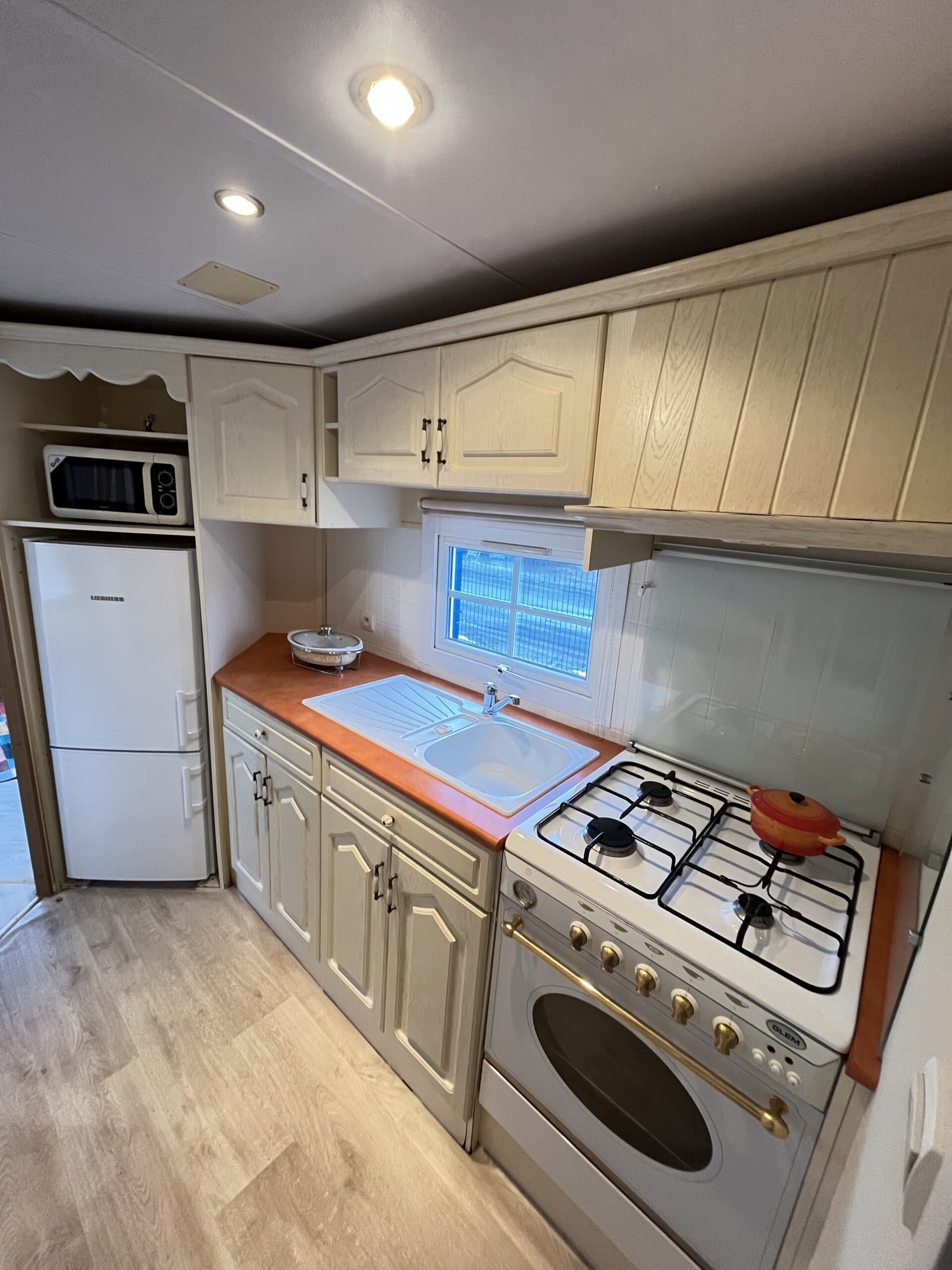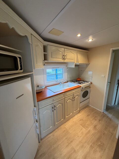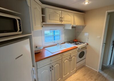 – KUCHNIA: szafki do przechowywania, zlew jednokomorowy z ociekaczem , gazówka czteropalnikowa z piekarnikiem, okap, lodówka, mikrofalówka