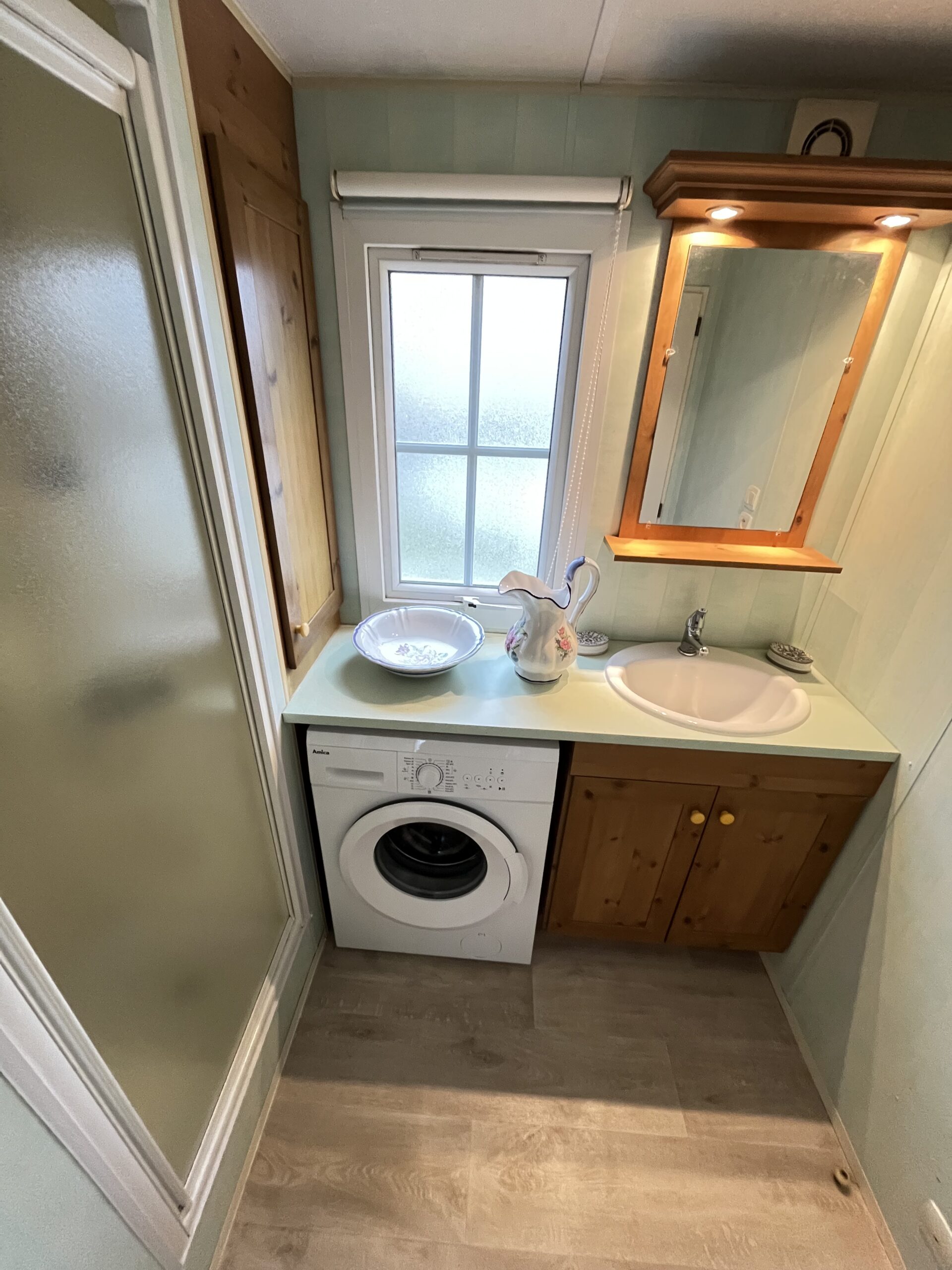 – ŁAZIENKA: umywalka z szafką, szafka, prysznic, pralka